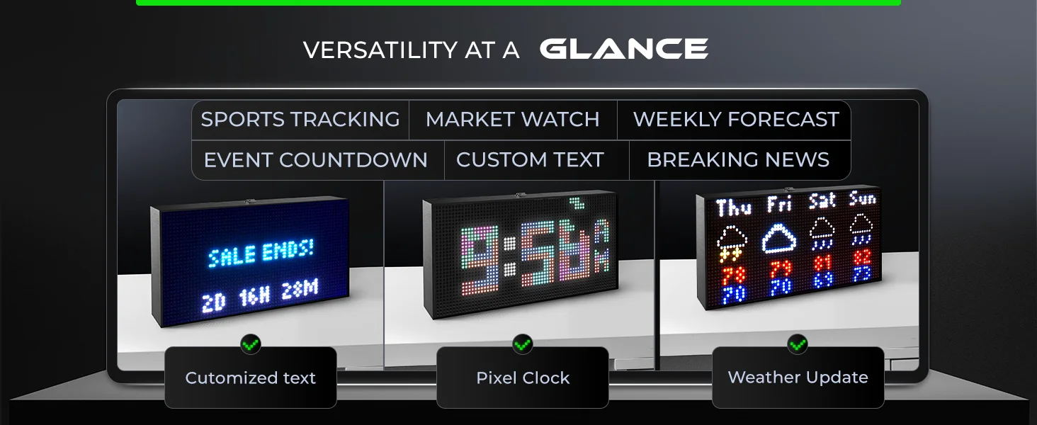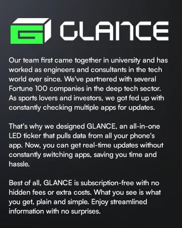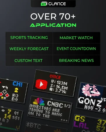 Real-Time Updates The Glance LED Ticker provides real-time updates on sports scores, stock prices, crypto updates, and weather. Stay informed instantly, improving your productivity and keeping you ahead.