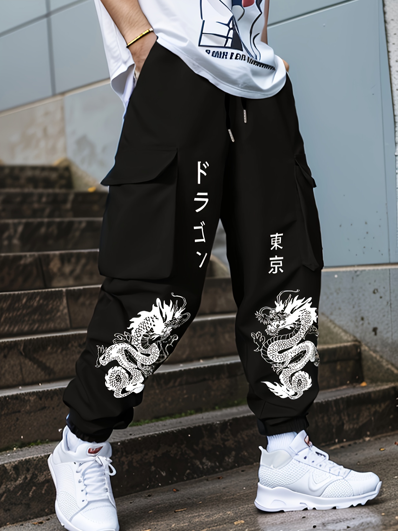 Men's Dragon Print Cargo Pants - Black, Loose Fit with Multi Pockets & Ankle-Len